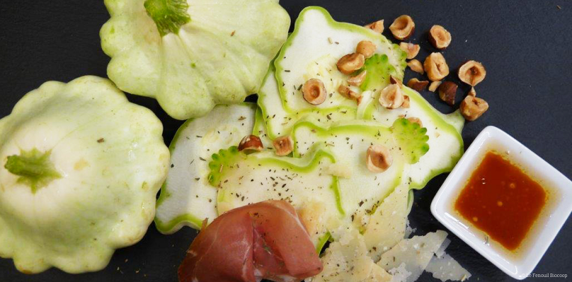 Fin août, début septembre, le moment précis où les étals regorgent de fruits et de légumes de saison, avec une telle diversité ! Quel bonheur de retrouver les petits pâtissons, des sortes de petites courges à la peau brillante et vert clair. Je les adore finement tranchés à la mandoline ! C’est ainsi qu’ils révèlent leur subtil parfum de noisette…