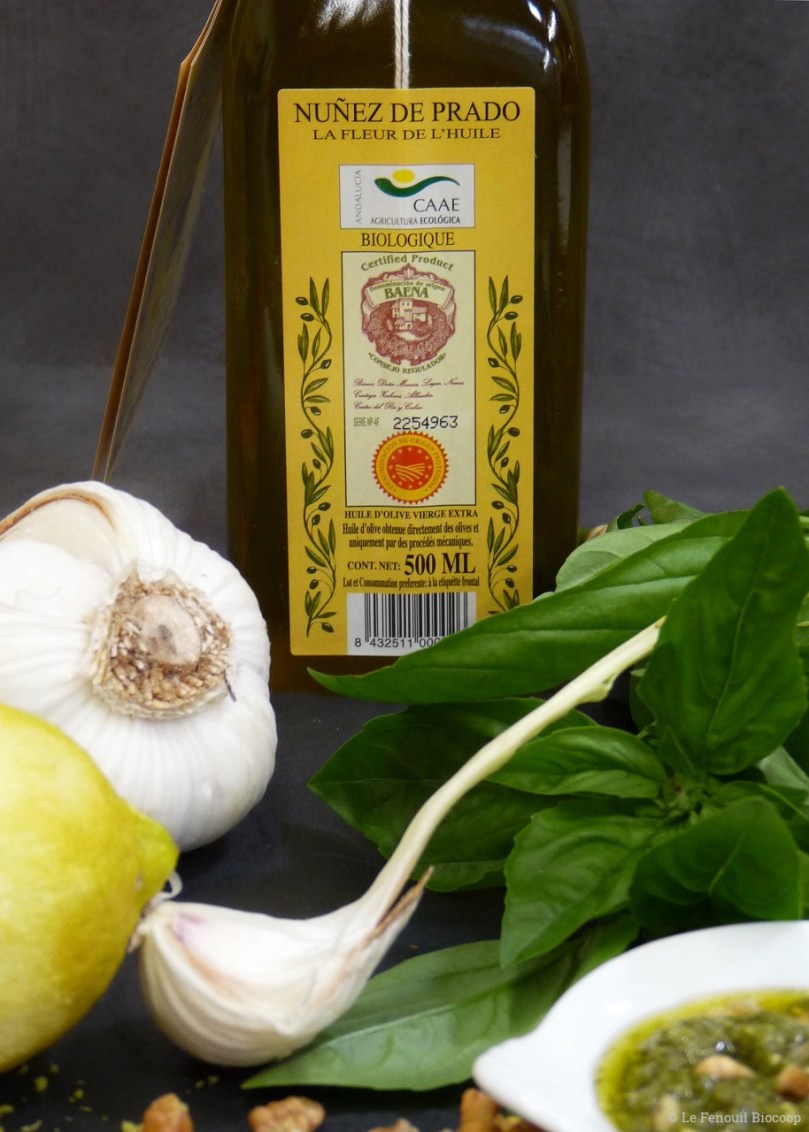 - Dans un blender, mettre les ingrédients suivants : le basilic, les cerneaux de noix, l’huile d’olive, l’ail pressé, le zeste de citron, le sel et le poivre. Mixer et déguster !