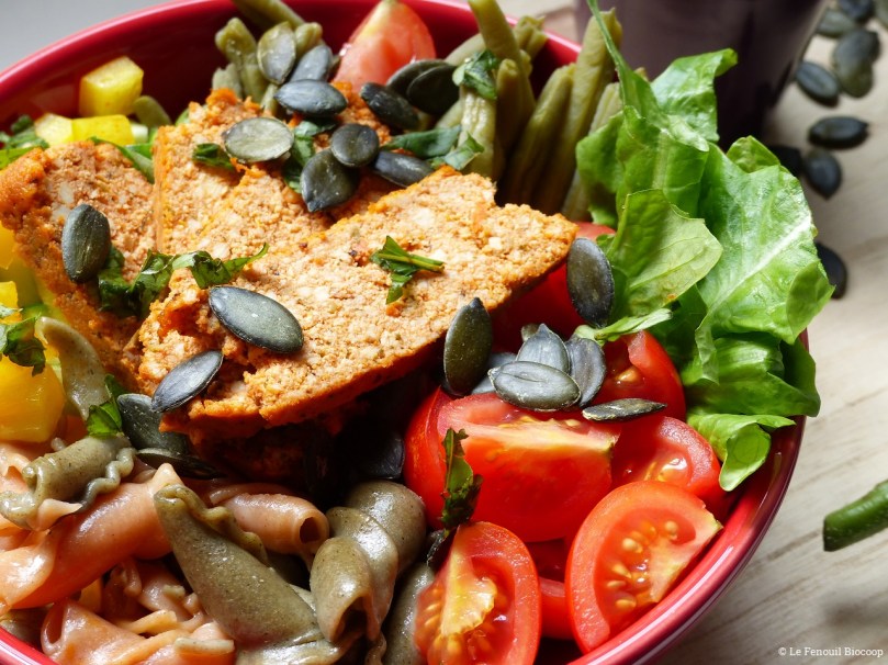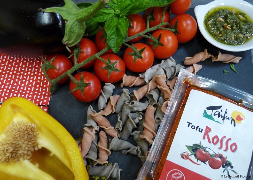 - Composer le salad bowl avec les pâtes au pesto, les tomates cerises coupées en deux, les poivrons marinés et les aubergines grillées coupés en lanières, le tofu rosso émietté et la roquette ciselée.