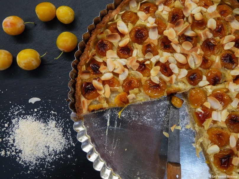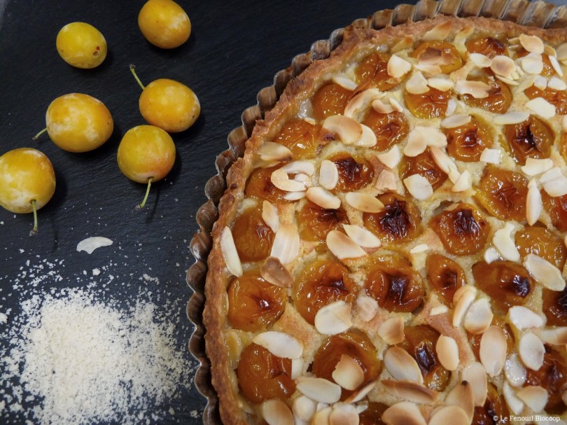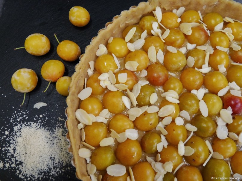 - Disposer les mirabelles sur la crème et ajouter les amandes effilées.