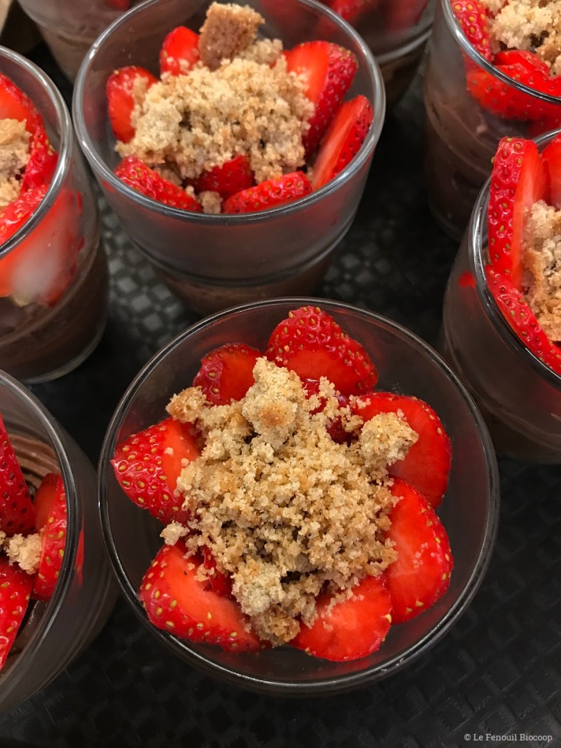 Je ne connais pas de dessert aussi simple à réaliser, aussi savoureux et aussi adaptable. C’est vraiment une réussite ! Il n’y a guère que les intolérants au soja qui ne puissent s’en délecter. Pour réaliser cette recette, vous trouverez au Fenouil Biocoop des palets de chocolat noir au rayon vrac, des sablés au sarrasin également en vrac, des fraises (oui ! c’est encore la saison des fraises !), sans oublier les oranges et le tofu soyeux.