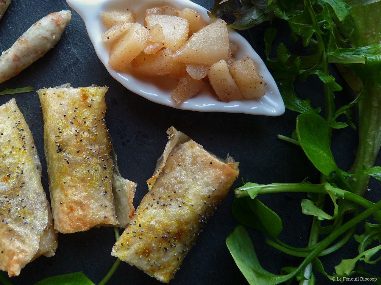 Le pliage des feuilles de brick ne comporte pas de difficulté, il est simple et à la portée de tou·tes. Cette garniture sucrée-salée s’accorde parfaitement avec un vin effervescent.