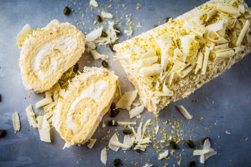 Au placard les traditionnelles bûches à la crème au beurre ! Cette année, je vous propose d’élargir vos horizons avec une bûche chocolat & tofu soyeux, une autre à la crème de châtaignes & aux myrtilles, une forêt noire sans lait… et cette merveilleuse bûche au citron !