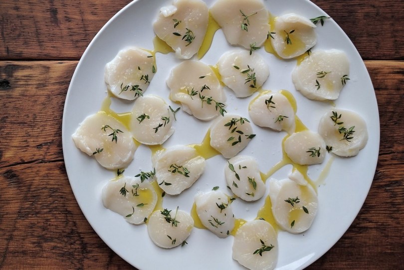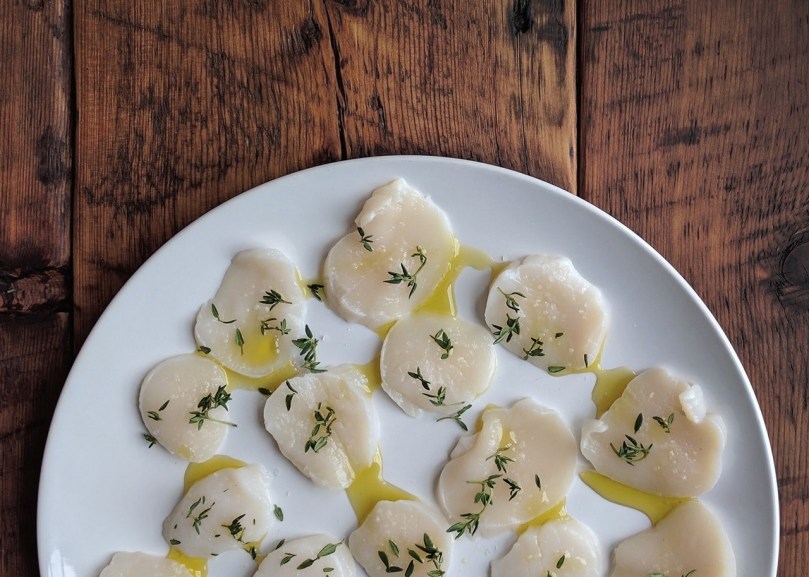 - Découper chaque noix de Saint-Jacques en trois disques et les disposer sans les superposer dans un récipient plat.