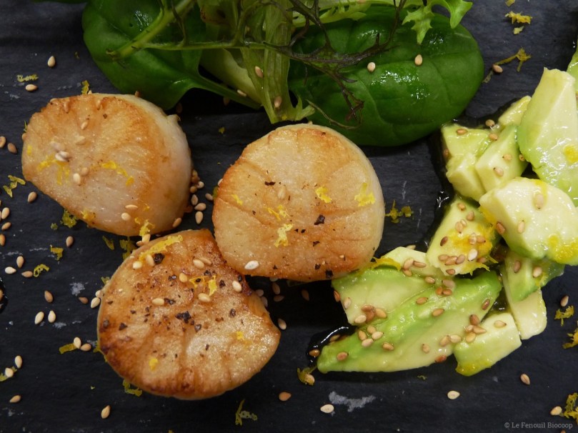 Noix de Saint-Jacques poêlées et avocats aux agrumes