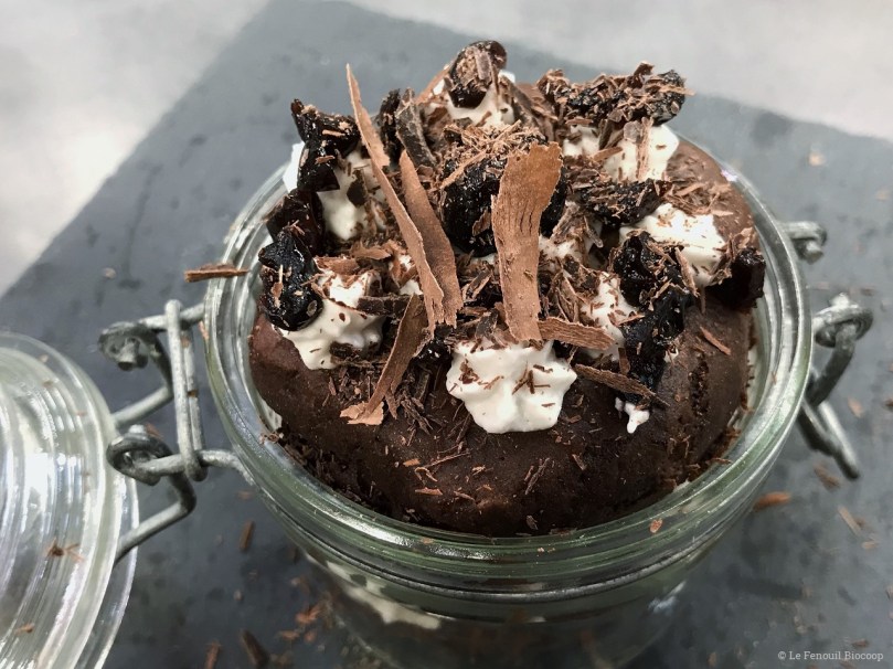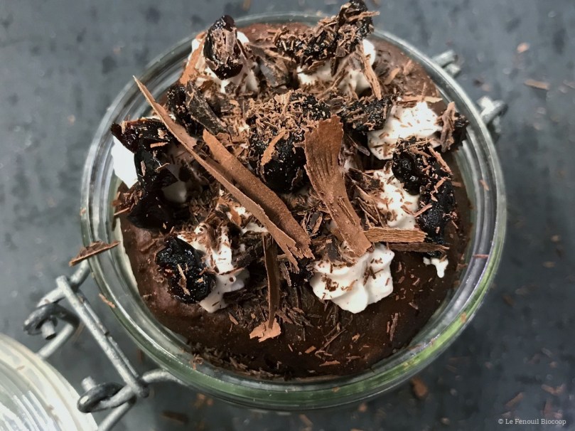 Verrines de Forêt-Noire, cerises confites et chantilly à la crème de coco (sans lait)