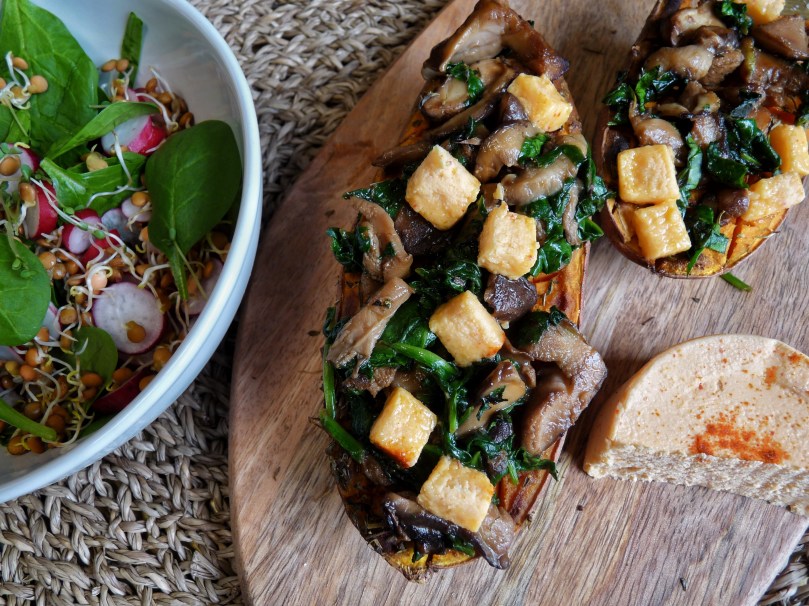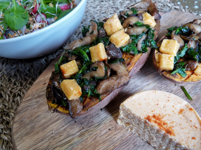 - Sortir les patates douces rôties du four et les garnir du mélange oignon-épinards-champignons.