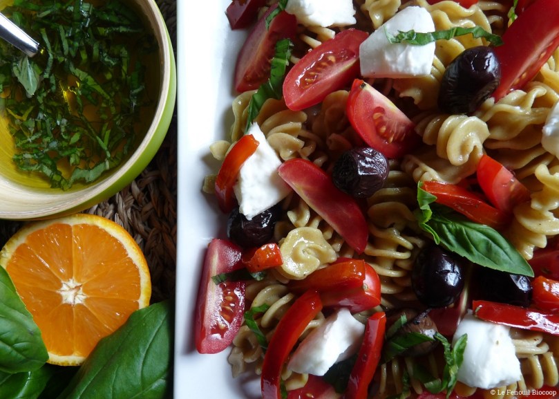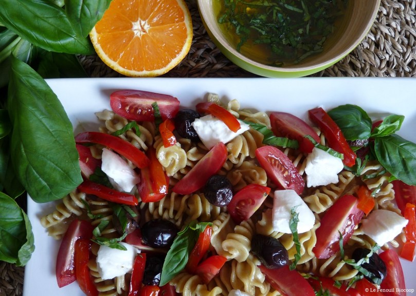Salade de pâtes à l'italienne, poivrons grillés et sauce aux agrumes