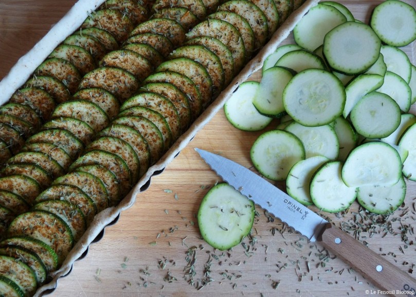 - Couper les courgettes en rondelles et les disposer sur la tarte. 6 Saupoudrer d’épices et d’herbes de Provence.