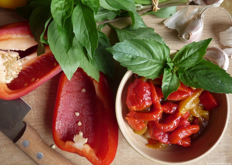 - À la sortie du four, réserver les poivrons dans un récipient hermétique. Lorsqu’ils ont bien refroidi, retirer la peau et découper les quartiers en lanières.