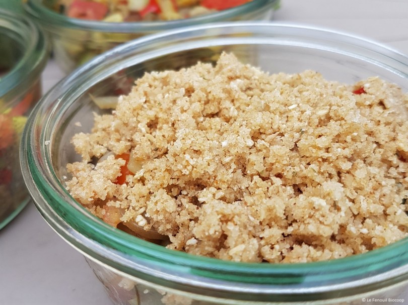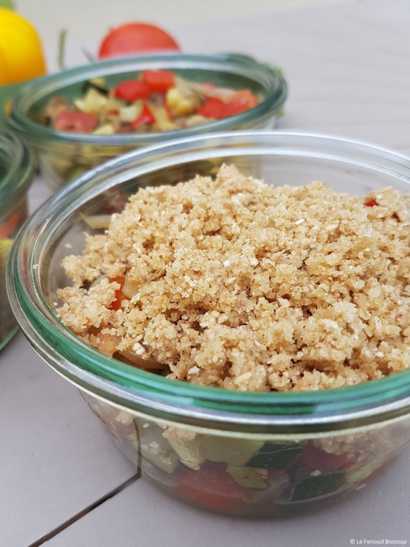 - Déposer les légumes dans un plat ou des ramequins allant au four et les recouvrir de crumble.