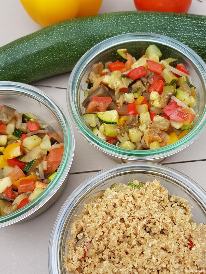 - Ajouter le poivron dans la sauteuse, laisser cuire 5 minutes. Ajouter l’aubergine et laisser cuire 5 minutes. Ajouter la courgette et laisser cuire 5 minutes. Enfin, ajouter la tomate et laisser cuire 5 minutes, puis assaisonner le tout à l’aide des herbes de Provence et du sel, et réserver hors du feu.