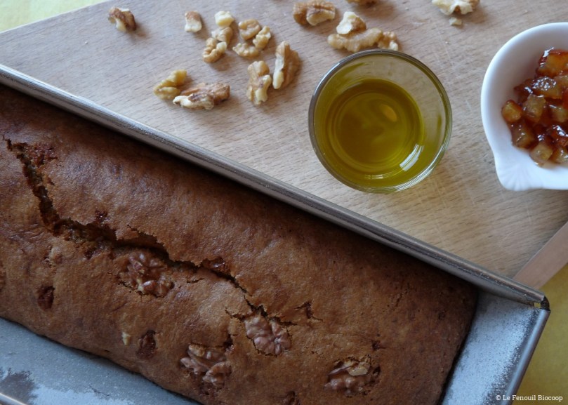 Cake aux noix, aux écorces d'oranges confites et à l'huile d'olive