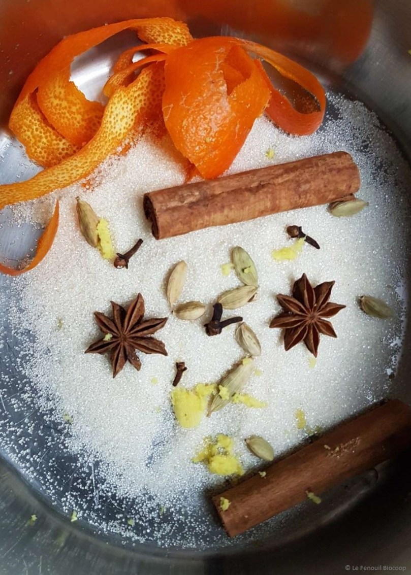 - Dans une casserole, faire chauffer sans faire bouillir le vin rouge avec le zeste d’orange, le gingembre, les bâtons de cannelle, l’anis étoilé, les clous de girofle, les capsules de cardamome et le sucre. Couvrir et laisser infuser environ une heure à feu doux.