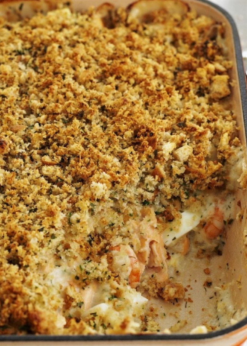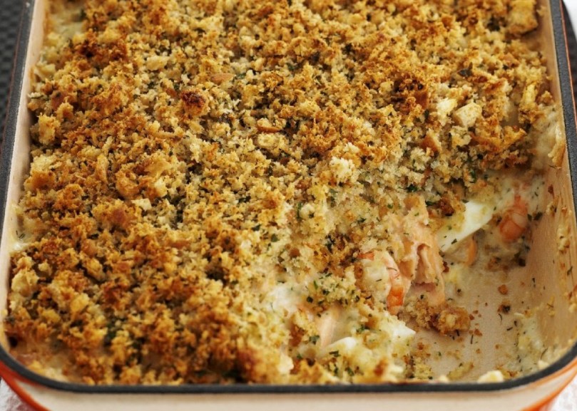 Après deux versions sucrées (crumble aux fraises, à la rhubarbe et à la noix de coco et crumble aux pommes et aux épices de Noël) et une revisite salée (crumble de légumes d’été au parmesan), je vous présente aujourd’hui une version « gastronomique » au saumon et au poireau.