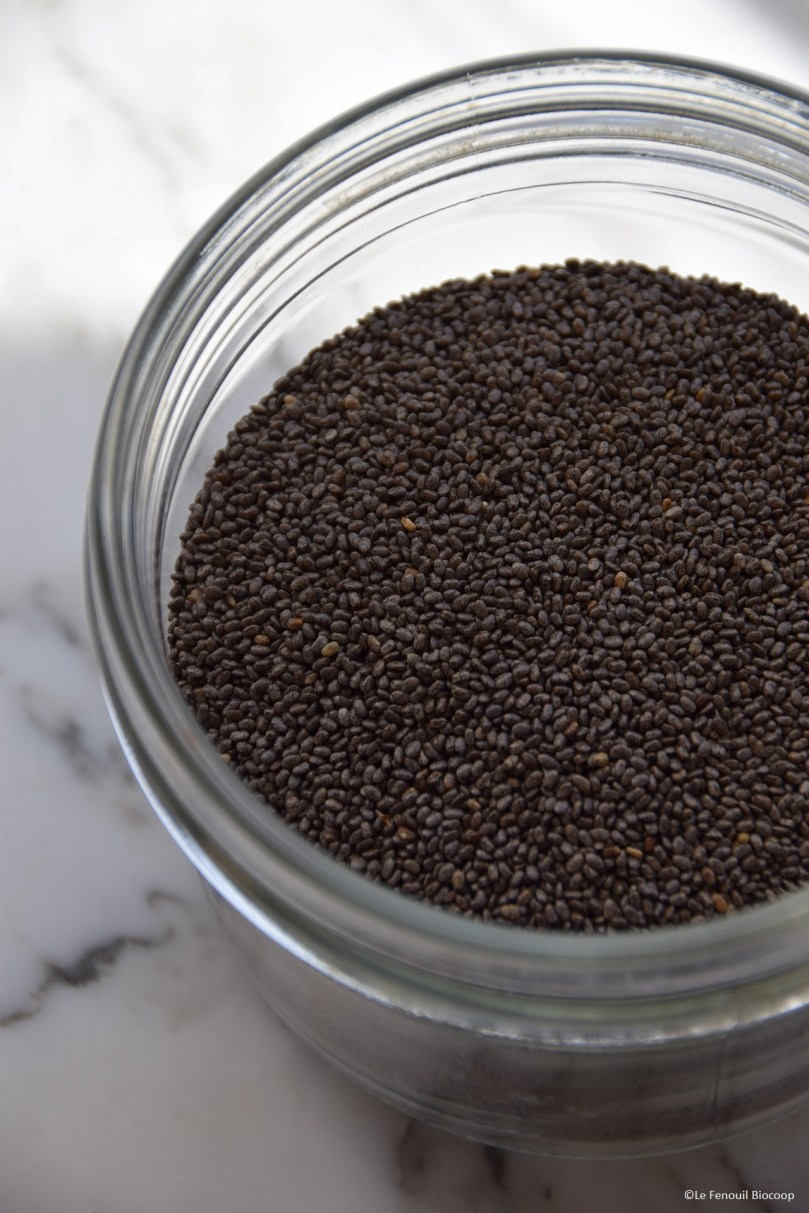 Trempées dans du liquide, les graines de chia ont un fort pouvoir gélifiant et j’aime beaucoup les utiliser pour réaliser des entremets, des porridges, des smoothies… et même de la «confiture», que je conserve jusqu’à une semaine au réfrigérateur.