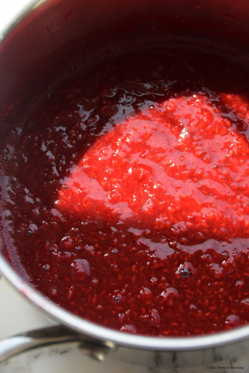 Deux possibilités pour réaliser la recette que je vous propose de découvrir aujourd’hui : utiliser des fruits crus ou les faire chauffer rapidement dans une casserole. N’ayant que des framboises surgelées sous la main (vestiges de mes cueillettes de l’été dernier), j’ai opté pour la deuxième option. Il est tout à fait possible de commencer cette recette à partir de l’étape n°2 !