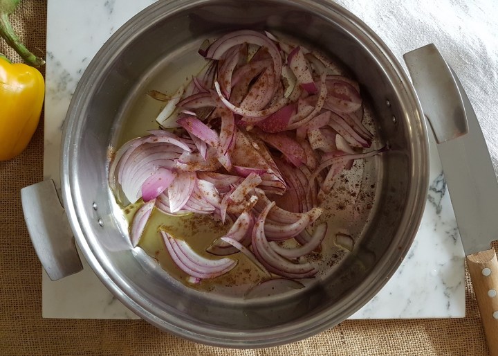 - Dans une sauteuse, verser l’huile d’olive et ajouter les oignons émincés, le mélange quatre épices et le mélange d’épices pour grillades. Faire revenir 5 minutes.