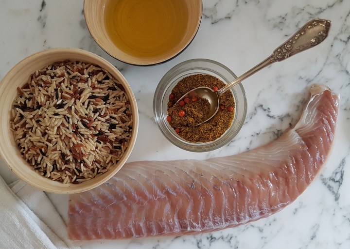 J’ai choisi le mélange de riz thaï complet « Trio brun, rouge et noir » Autour du Riz disponible en vrac car l’association riz/poisson est un grand classique de la cuisine française.