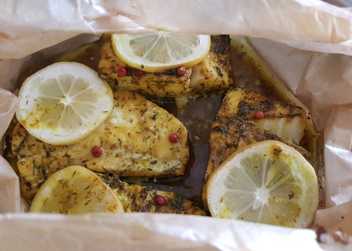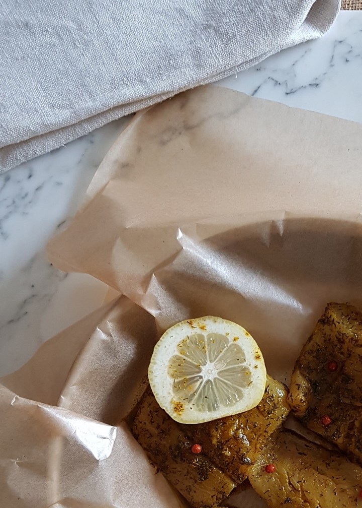 Après avoir enduit mon dos de lieu d’épices, d’huile d’olive, de jus de citron, etc. et l’avoir assaisonné, je l’ai tout simplement enveloppé dans du papier cuisson écologique pour qu’il cuise à l’étouffée : fondant, moelleux, parfumé… absolument parfait !