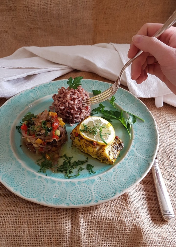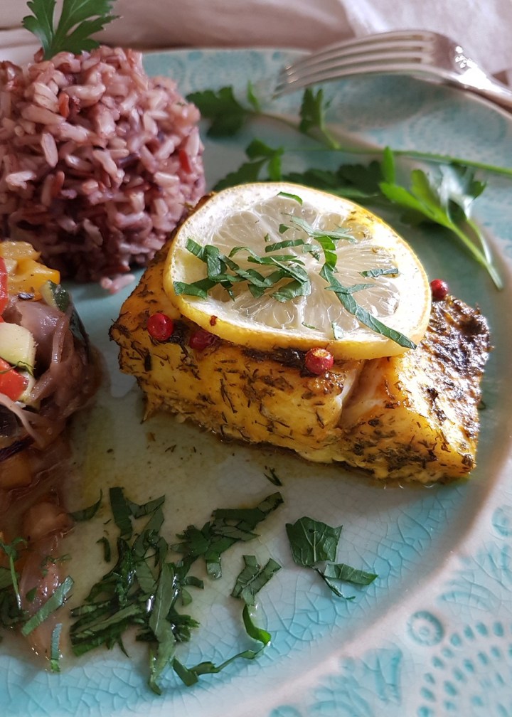 J’ai sublimé mon dos de lieu à l’aide du mélange d’épices en vrac Terra Madre appelé « Mélange poisson », disponible au Fenouil Sargé et composé de curcuma, de fenouil, d’aneth, de coriandre, d’anis et de baies roses.