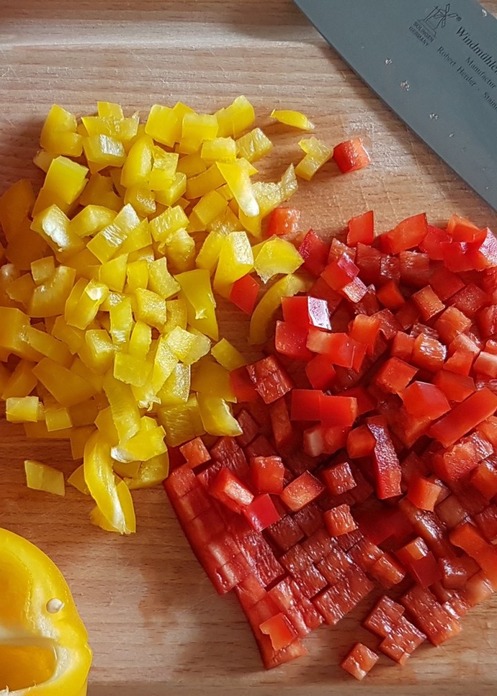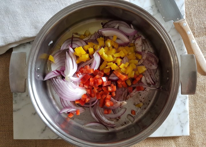 - Ajouter la macédoine de poivrons et faire revenir 5 minutes.