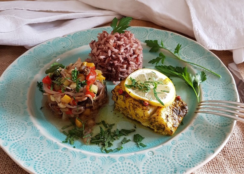 Après avoir enduit mon dos de lieu d’épices, d’huile d’olive, de jus de citron, etc. et l’avoir assaisonné, je l’ai tout simplement enveloppé dans du papier cuisson écologique pour qu’il cuise à l’étouffée : fondant, moelleux, parfumé… absolument parfait !