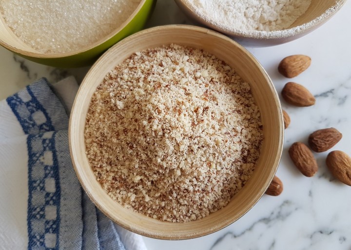 Détail important : dans cette recette, j’ai choisi d’utiliser des amandes complètes que j’ai réduites en poudre à l’aide d’un blender : l’arôme d’amande est plus développé qu’avec la poudre d’amande blanche disponible en vrac, même si cette dernière convient tout à fait !