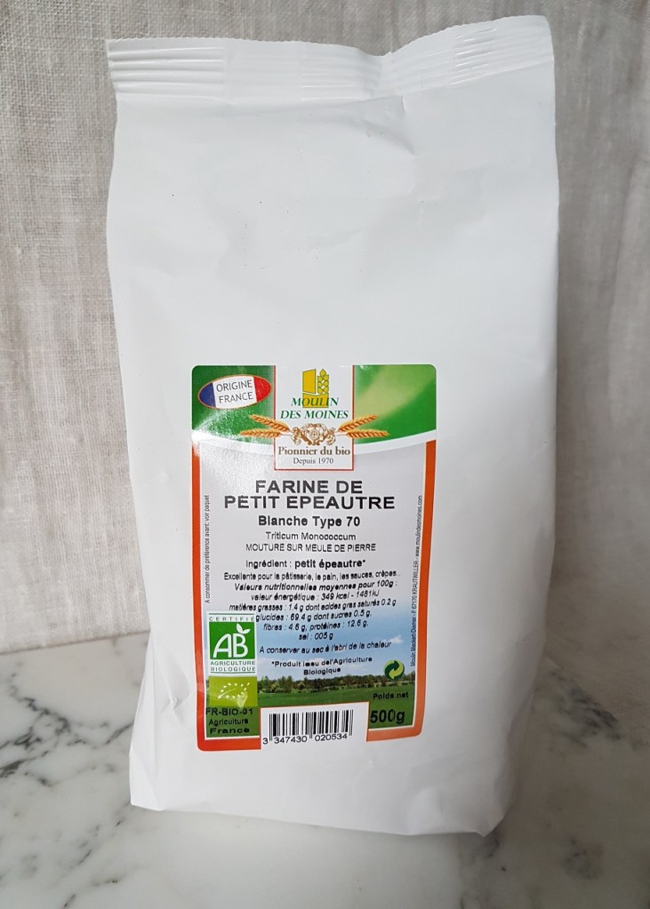 Pour la pâtisserie, j’ai toujours une petite faiblesse pour la farine de petit épeautre T70. Elle est très simple à utiliser pour toutes les préparation à pâte non levée.