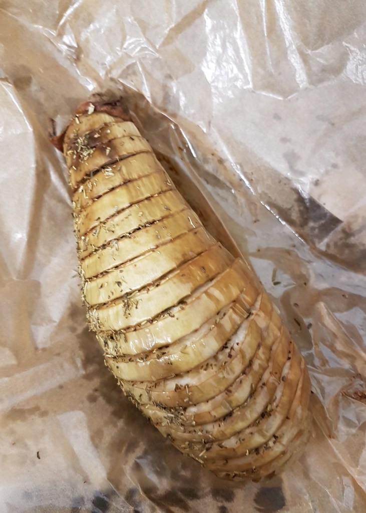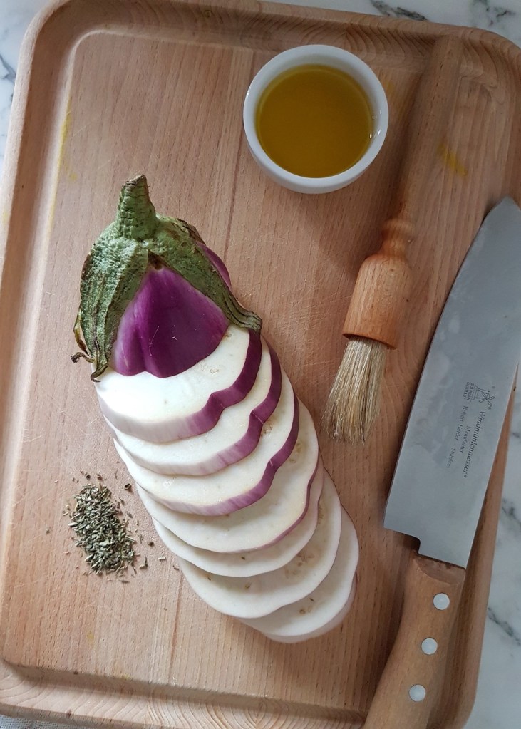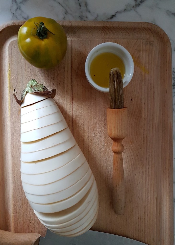 - Lave les aubergines, les essuyer et les découper en gardant les tranches solidaires les unes des autres.