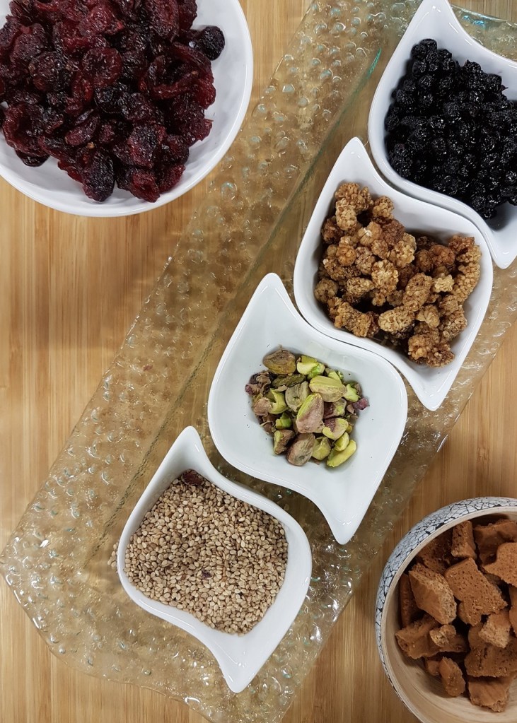 - fruits secs : noisettes*, pistaches*, noix*, amandes*, brisures de biscuits spéculoos*, noix de coco râpée, baies de goji, myrtilles, mulberries, raisins secs… *peut contenir des allergènes