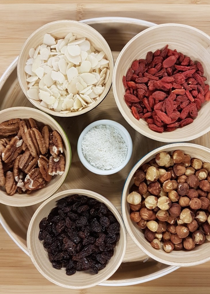 - Répartir tous les fruits secs dans de petits récipients (cela paraît anodin mais c’est bien plus pratique de travailler ainsi).