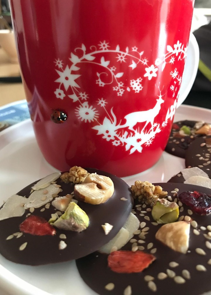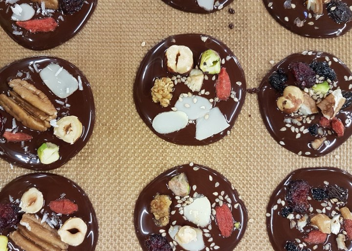 - Avant que le chocolat ne durcisse, incruster les fruits secs sur chaque cercle de chocolat. Recommencer l’opération jusqu’à ce que la casserole soit vide.