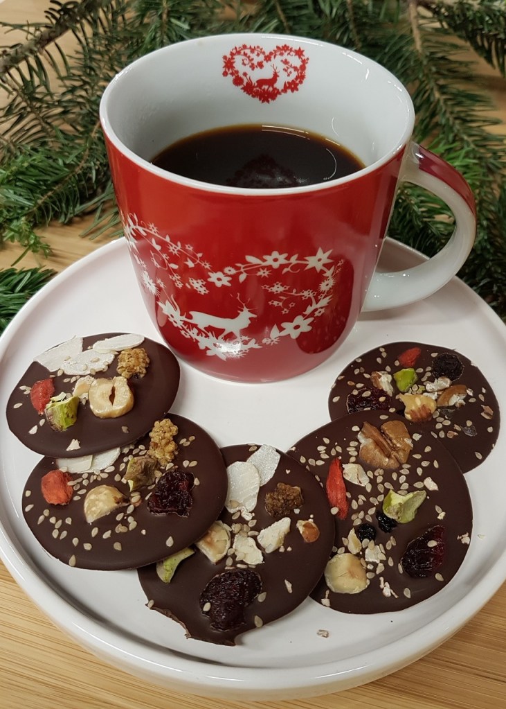 Mon astuce gourmande : servir les mendiants avec une délicieuse boisson de Noël, comme un chai au lait végétal, un glögg (vin épicé de Noël) ou encore un bon vieux chocolat chaud !