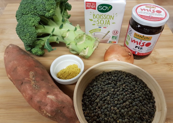 - Vérifier la cuisson des lentilles et des légumes, puis ajouter le lait de soja et le miso avant de mixer dans un blender,