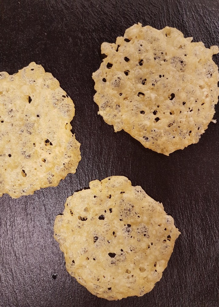 Pour réaliser vos tuiles de fromage bio : il suffit de râper le fromage, de le disposer en cercles (à l’aide d’un emporte-pièce) sur une plaque de cuisson et d’enfourner 6 minutes à 200°C.