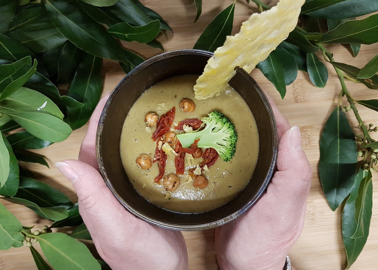 Soupe crémeuse de brocoli aux lentilles vertes et tuile de fromage