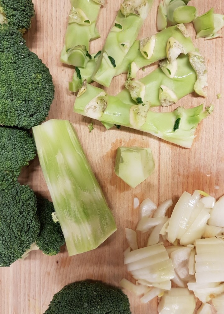 J’ai choisi le chou brocoli, un chou qui fera de cette soupe un merveilleux velouté ! À cette occasion, je vous explique comment tout utiliser de la tête de brocoli : sa tige finit régulièrement à la poubelle, ou au mieux au compost, alors qu’il suffit de l’éplucher succinctement pour en supprimer les parties trop fibreuses et garder la « moelle » du pied de brocoli.
