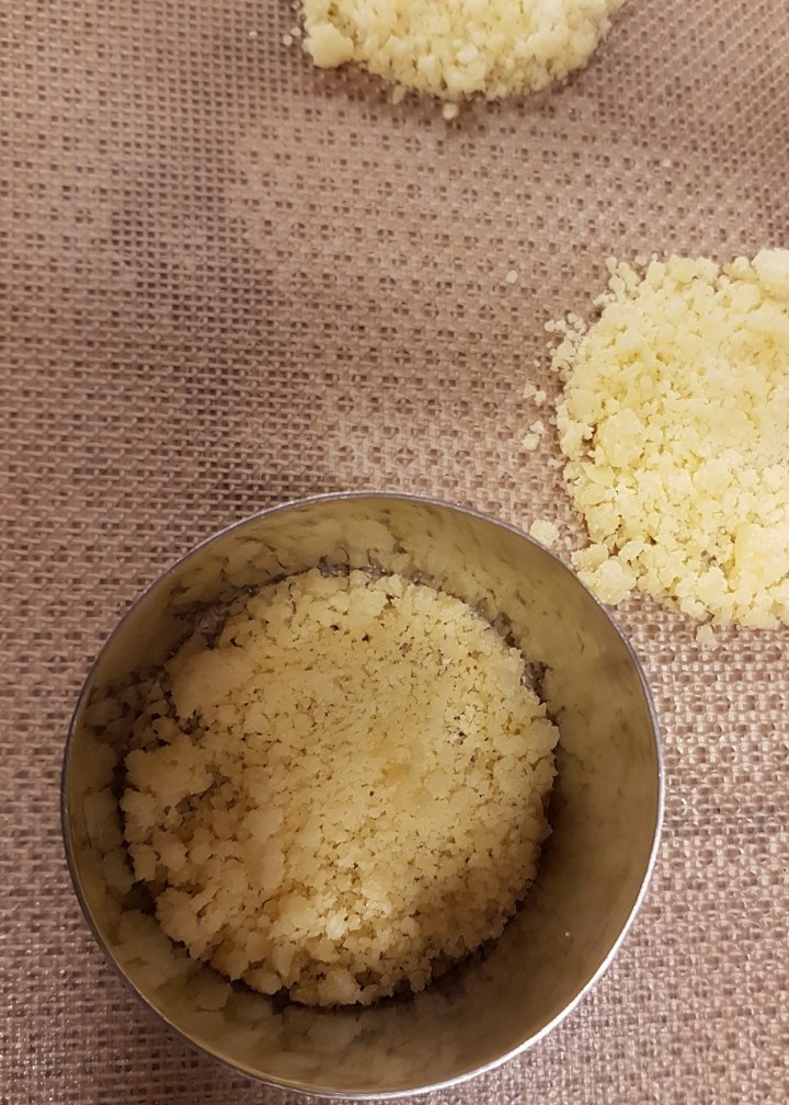 - Pendant ce temps, réaliser les tuiles : râper le fromage, le disposer en cercle (s’aider d’un emporte-pièce) sur une plaque de cuisson et enfourner 6 minutes à 200°C.