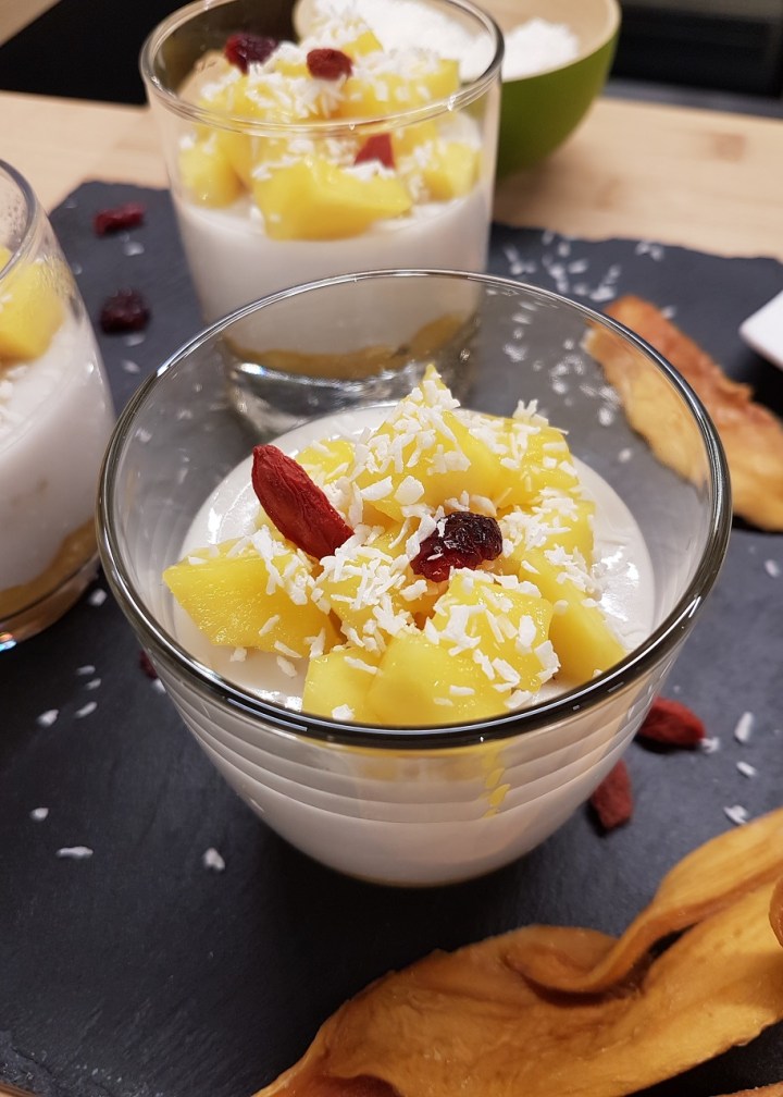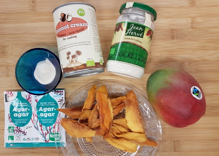 Dans cette recette de dessert gourmand sans lait, nous mettons davantage l’accent sur des produits exotiques tels que la crème de coco et la mangue séchée issues du commerce équitable. Pour celles et ceux qui ne connaissent pas ce produit, nous vous initions également à l’utilisation de l’agar-agar !