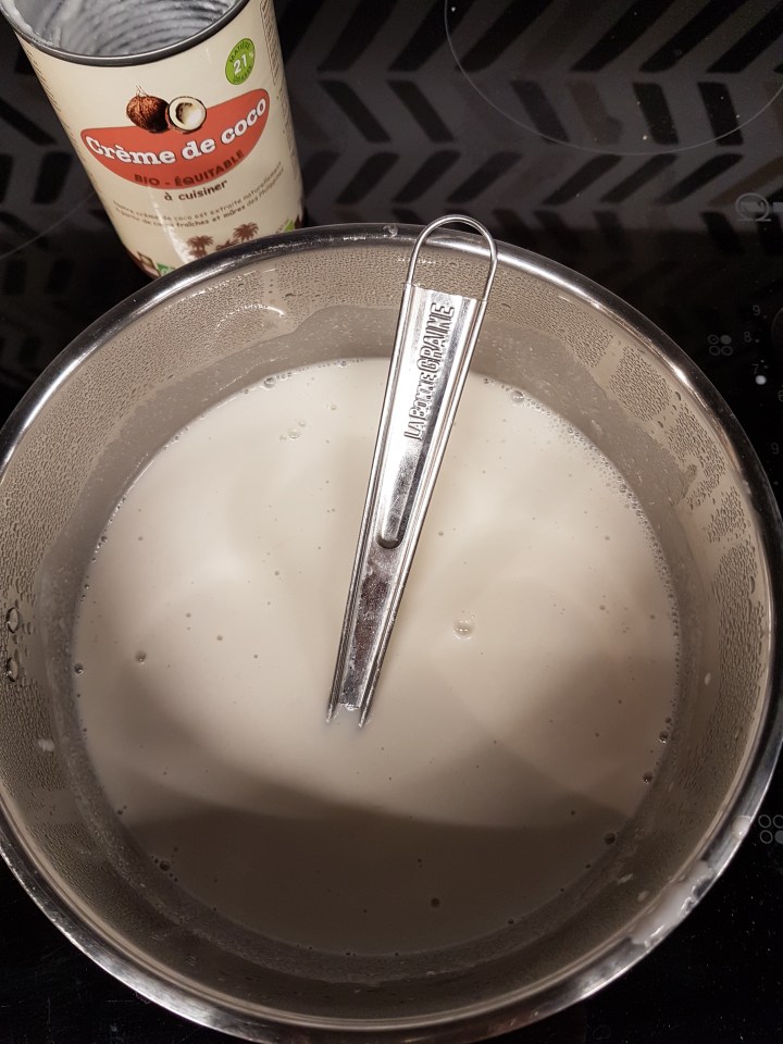 - Ajouter la crème de coco et le sucre glace. Mélanger.