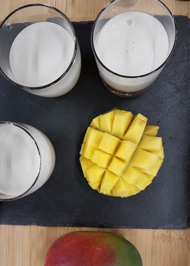 - Mixer grossièrement la mangue, puis répartir dans le fond de 4 à 6 verrines. Réserver.