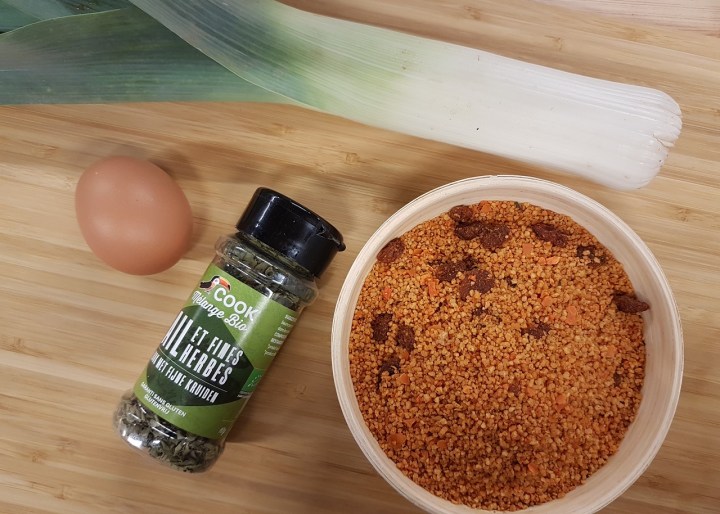 - Casser l’œuf dans un bol, ajouter le poireau cuit, les fines herbes, la semoule et mélanger.