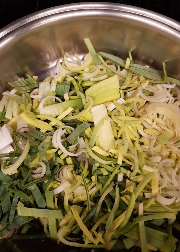 - Émincer le poireau, le faire revenir dans une sauteuse avec l’huile d’olive et les graines de cumin, puis réserver.