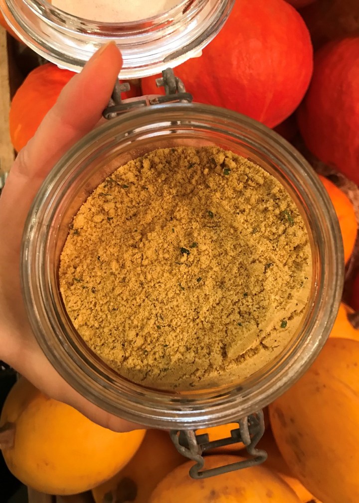 J’aime particulièrement ce bouillon en poudre car il contient de la poule, mais aussi des épices (noix de muscade, coriandre et curcuma) et des herbes aromatiques (feuilles de livèche, persil et romarin).