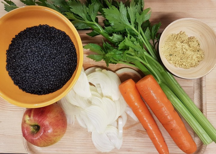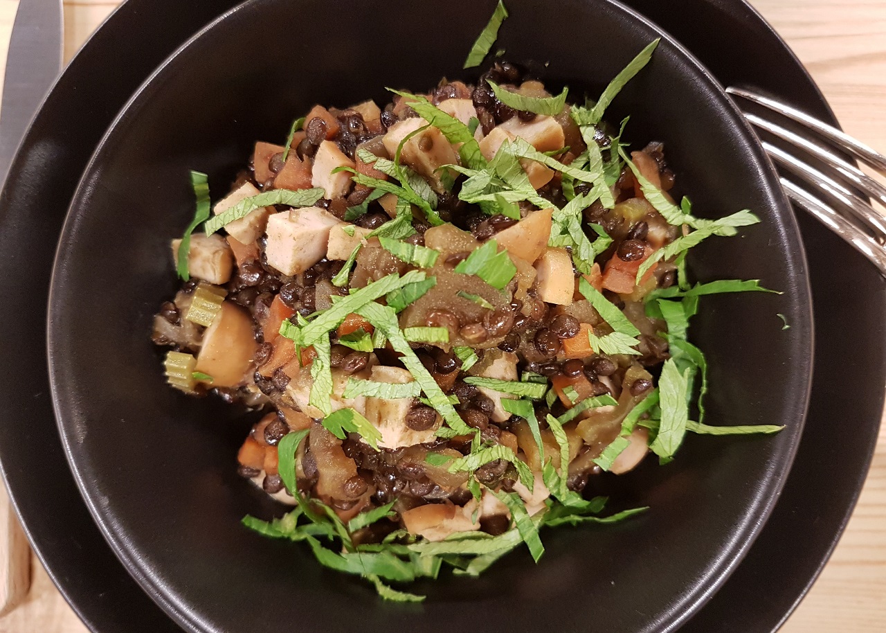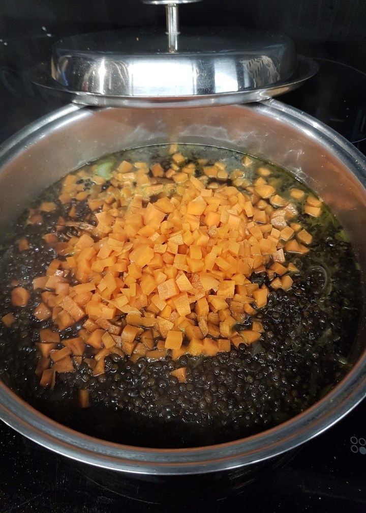 Une fois n’est pas coutume, je vous propose de cuire ces lentilles à la manière d’un risotto, en ajoutant un peu de bouillon au fur et à mesure de la cuisson, bien que les lentilles n’apportent pas le crémeux d’un riz Carnaroli, bien sûr !