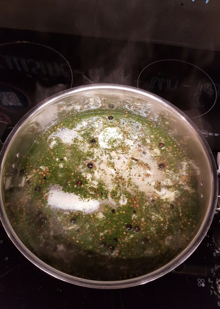 - Faire chauffer l’eau dans un large faitout et y ajouter le mélange pour court-bouillon. Porter à ébullition et y plonger les filets de poisson entiers.