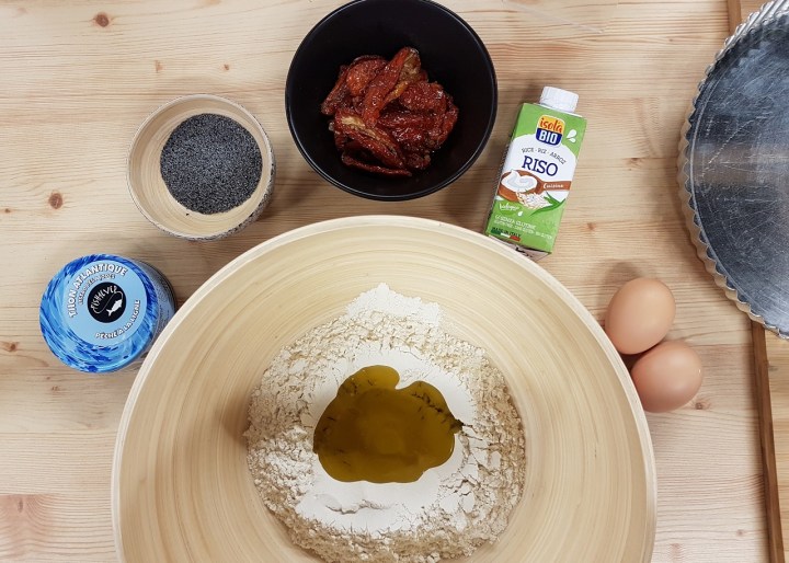 Dans cette recette, en plus de la farine d’épeautre et de l’huile d’olive en vrac, j’ai également utilisé des graines de pavot et des tomates séchées. Pour se servir en magasin, c’est très simple : un sac réutilisable pour les graines de pavot et un petit bocal propre pour les tomates.
