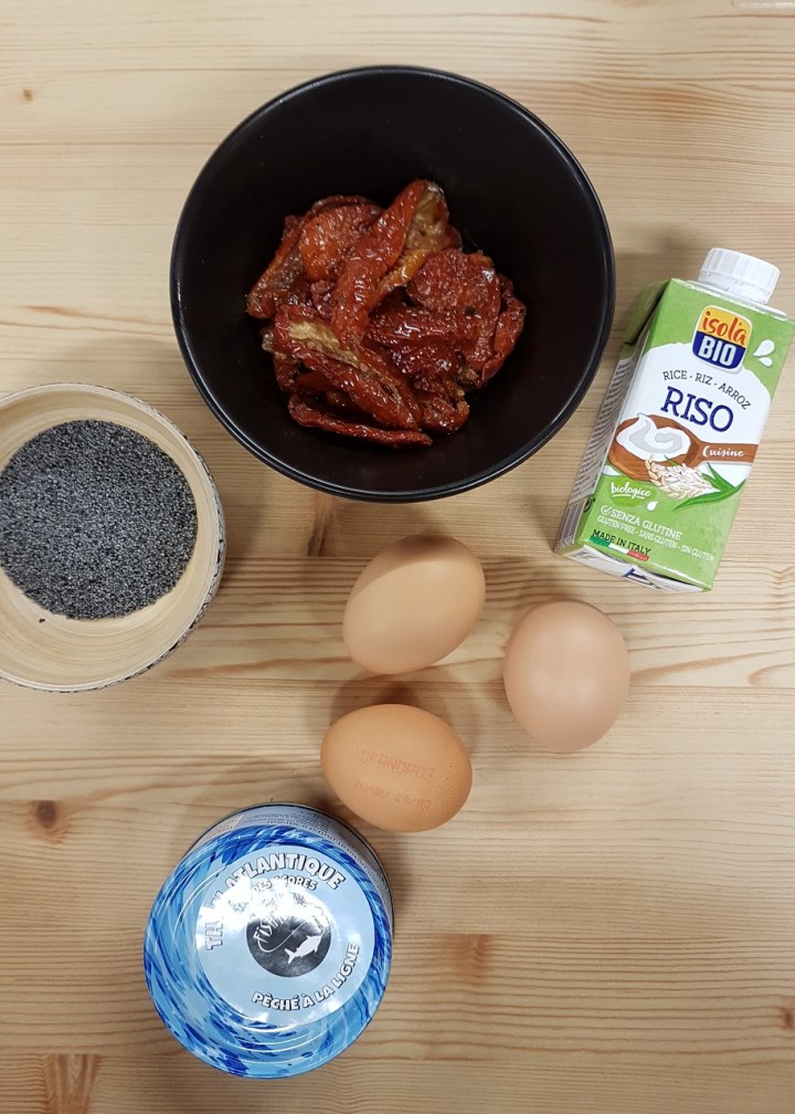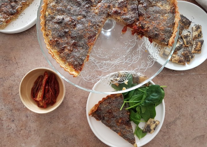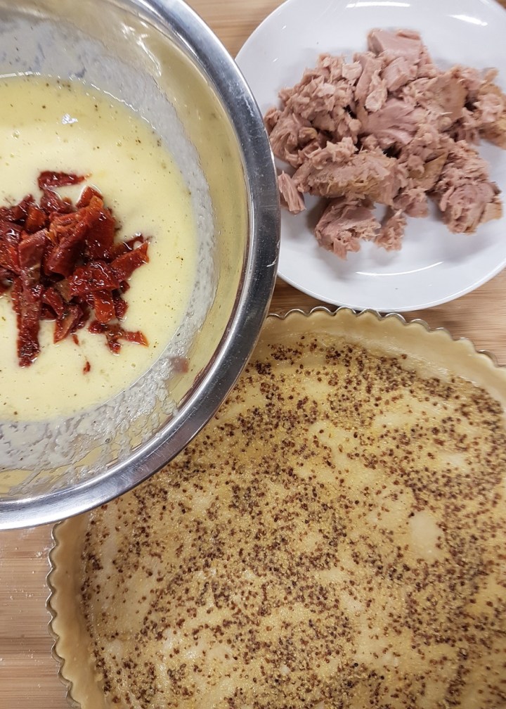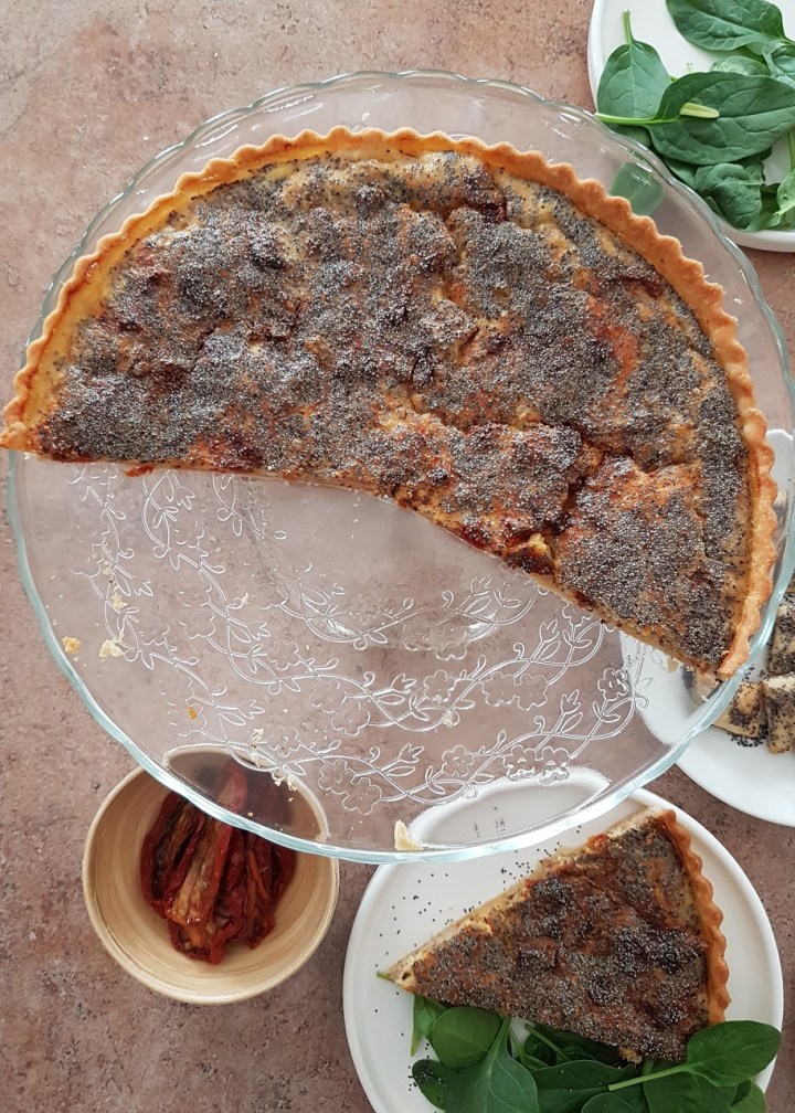 Quiche au thon, tomates séchées, moutarde à l’ancienne et graines de pavot