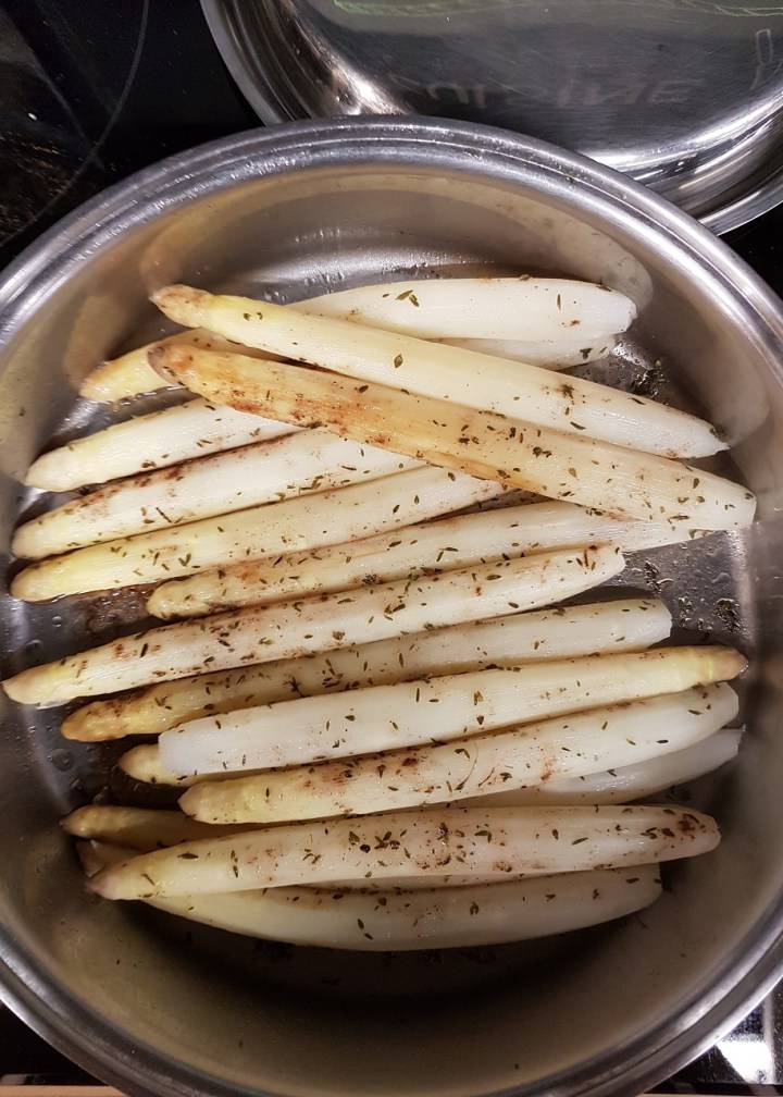 La cuisson des asperges se fait le plus souvent à l’eau ou à la vapeur, aussi peu de temps que possible pour conserver texture et couleur. Personnellement, je la cuis à l’étouffée pendant environ 15 à 20 minutes maximum pour avoir une meilleure concentration des arômes !